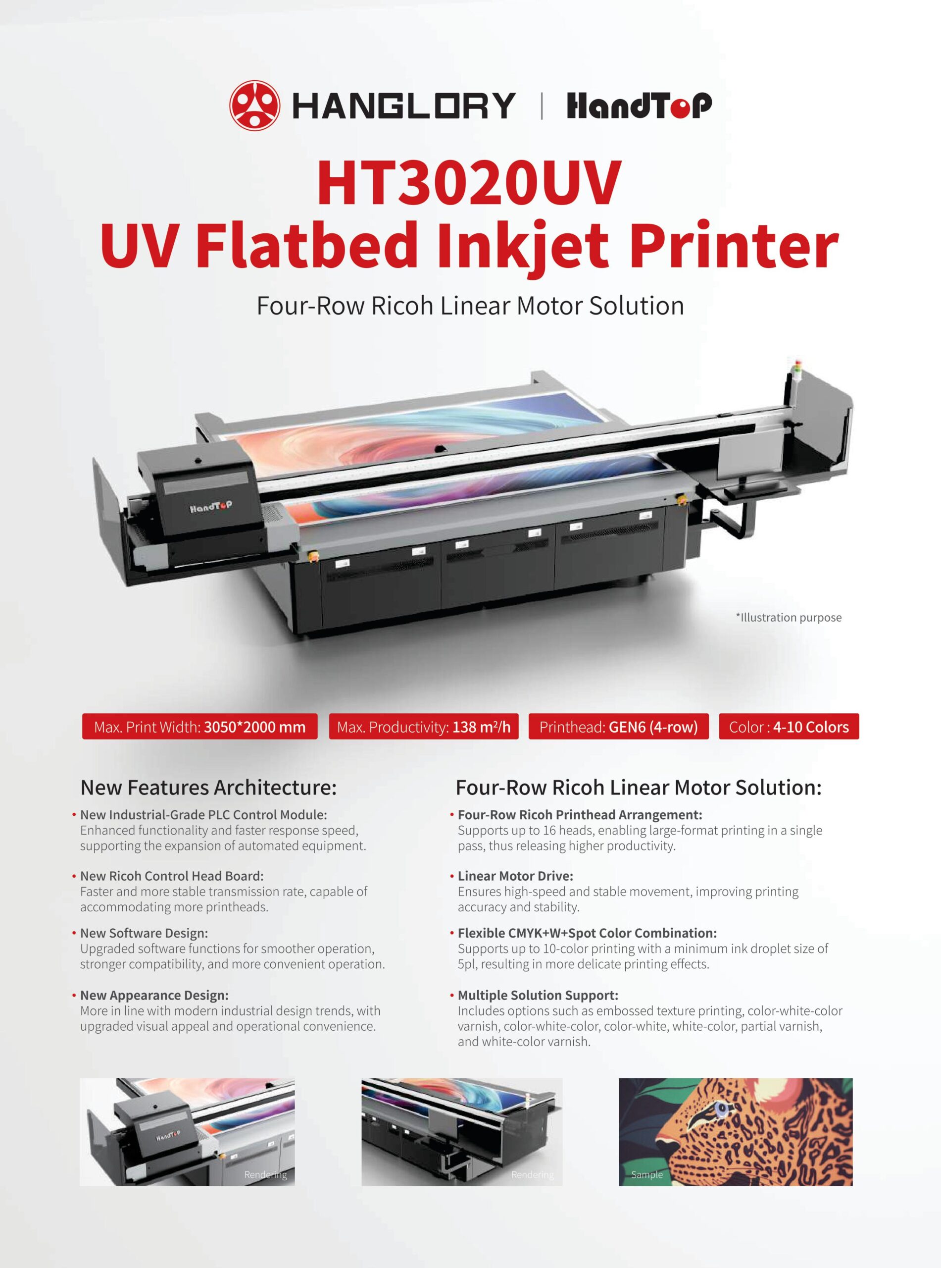 The HandTop HT3020UV is a high-performance large-format UV flatbed printer, engineered for industrial-scale productivity with exceptional image quality. With a print area of 3050 × 2000 mm and speeds up to 138 m²/h, it delivers vibrant, precise color across 4 to 10 channels, making it ideal for signage, packaging, and industrial applications.