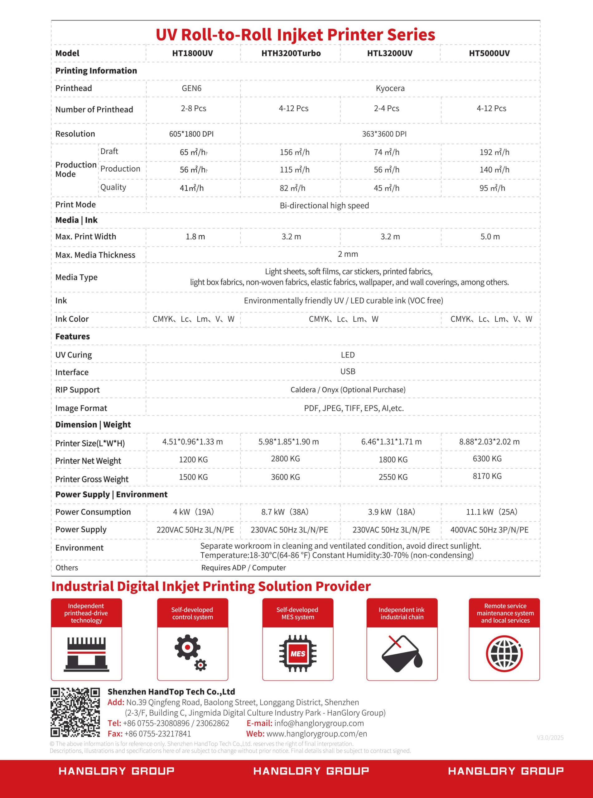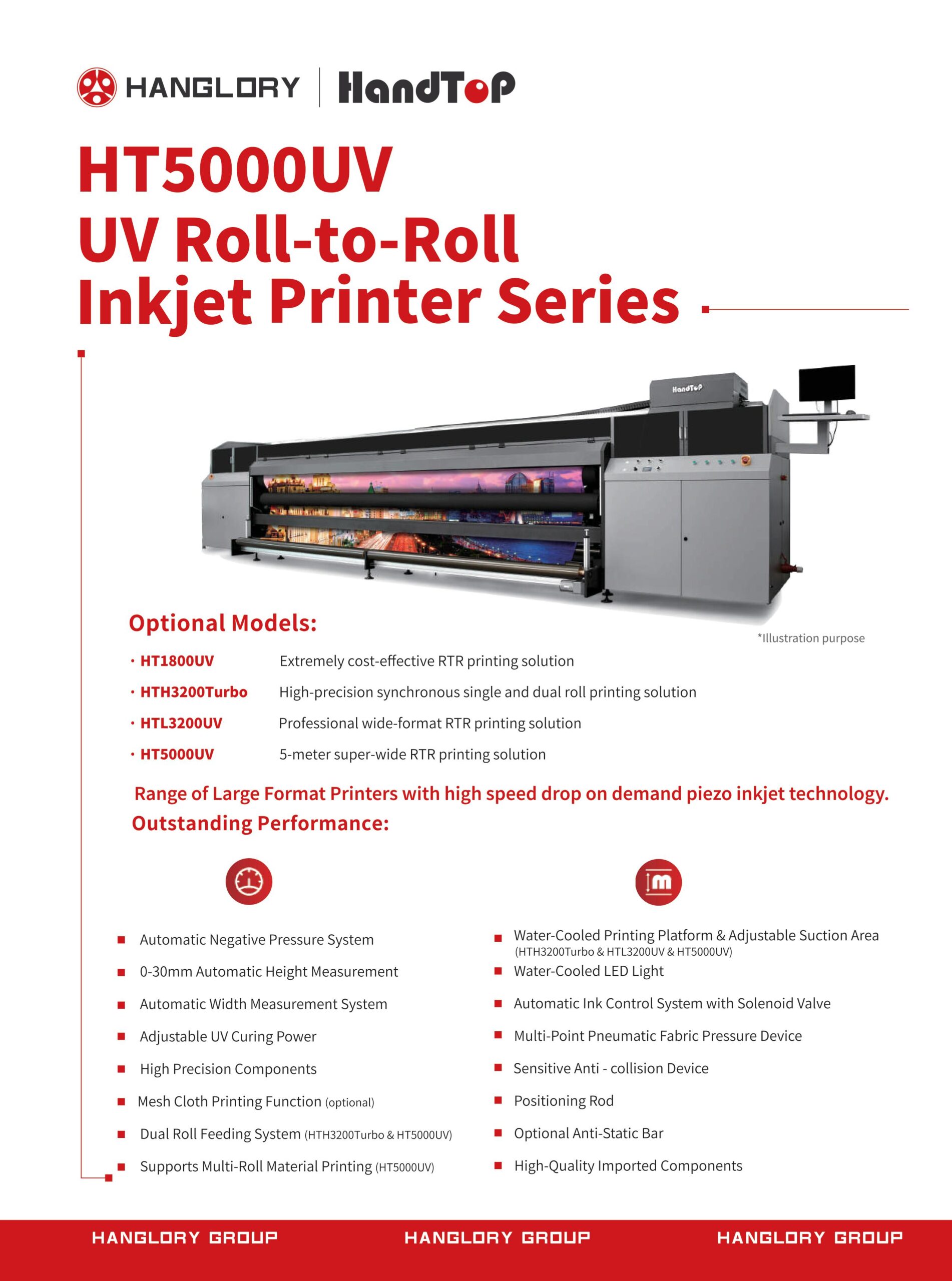 The HandTop HT5000UV is a high-performance industrial-grade UV roll to roll wide-format printer engineered for demanding large-format graphics and signage production. Built around reliable Kyocera piezoelectric printhead technology with configurable head counts (typically 4–12), it delivers high productivity across various quality modes, achieving speeds up to 192 m²/h with maximum print widths of 5 meters. The machine supports flexible UV ink with a broad color set (including CMYK, light colors, and white) and LED UV curing for consistent, durable results on a wide range of flexible materials such as films, banners, textiles, and backlits.