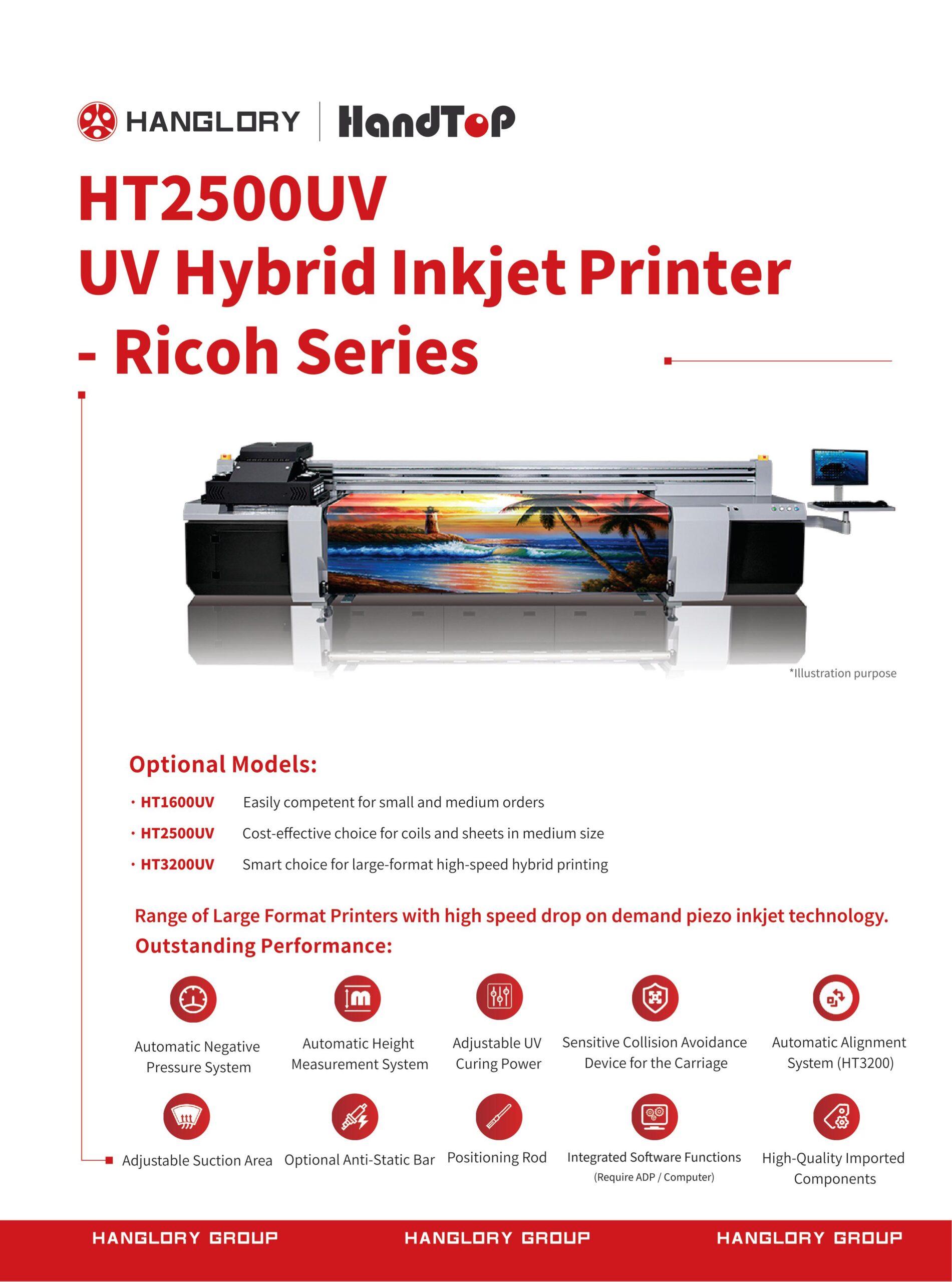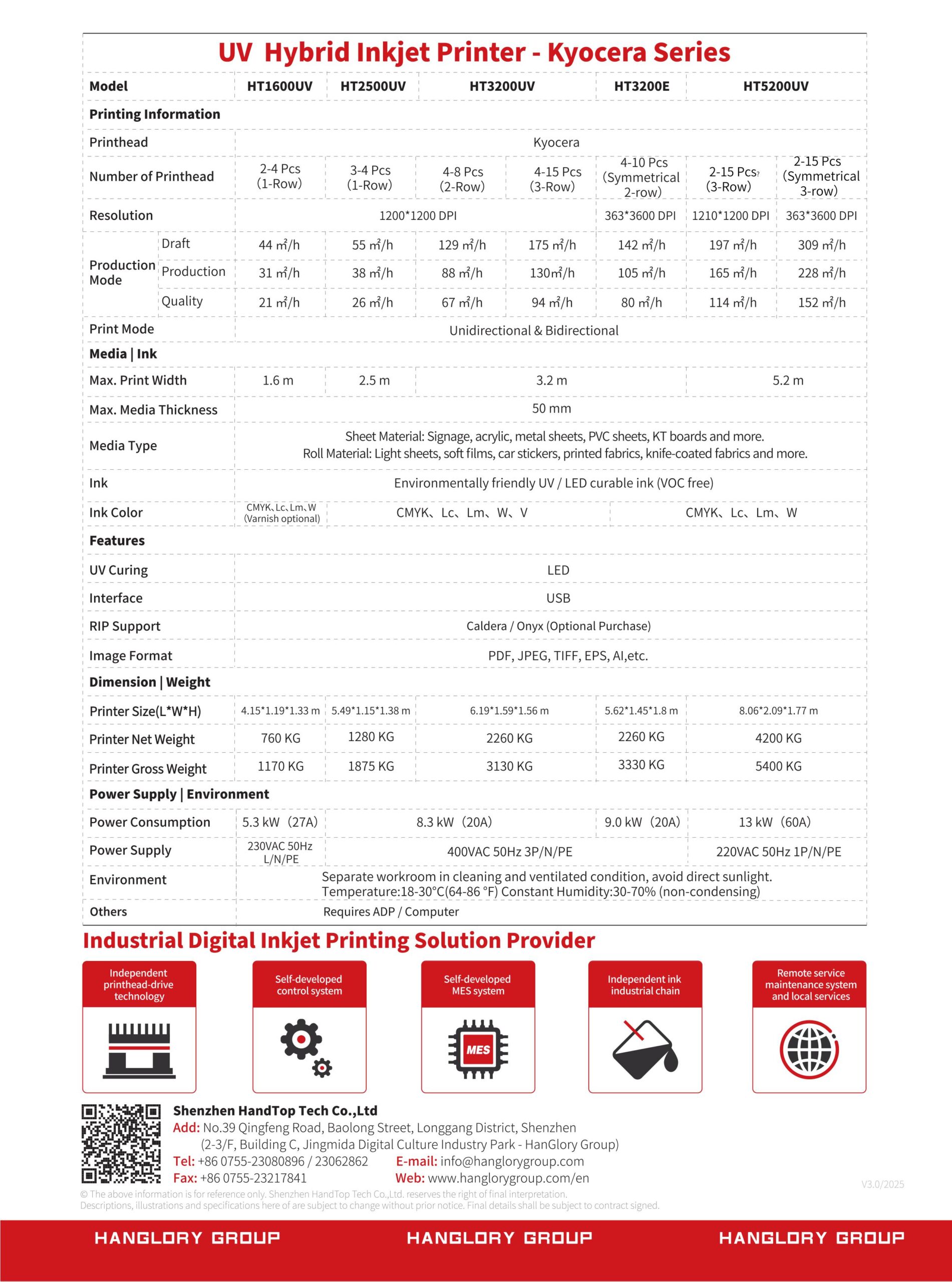 PrintheadKyocera & Ricoh Resolution1200*1200 DPI Max Print Width2.5 m Max Media Thickness50 mm Print Speed (Ricoh solution)Up to 65㎡/h (Draft) 44㎡/h (Production) 30 ㎡/h (Quality) Print Speed (Kyocera solution)Up to 55 ㎡/h (Draft) 38 ㎡/h (Production) 26 ㎡/h (Quality) UV CuringLED Color ConfigurationCMYK, Lc, Lm, White, Varnish InkEnvironmentally friendly UV / LED curable ink (VOC free) Media SupportWide variety of rigid and flexible materials Power Supply400VAC 50Hz 3P/N/PE RIP SoftwareCaldera